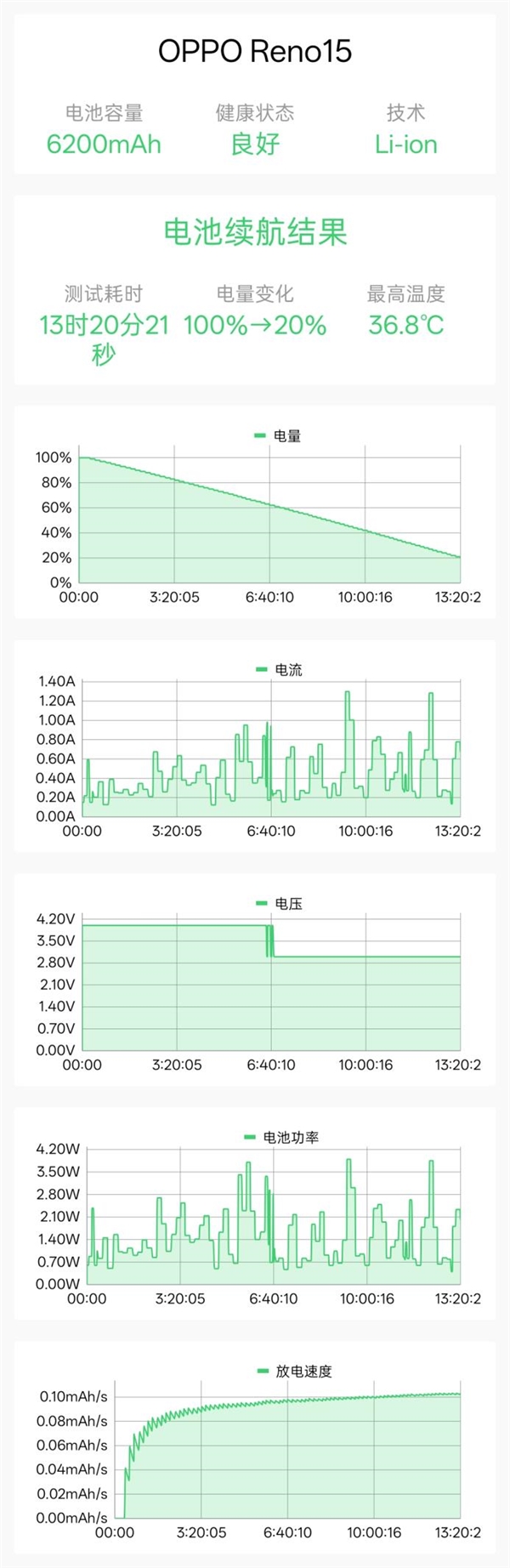 测试结果显示,Reno 15在续航测试中坚持了13小时20分钟,理论满电续航为16小时40分钟。这个数据相比一些7000mAh的电池都要长,再也不用担心续航问题。