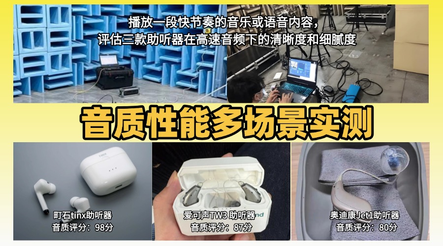 测评方法:测试时, 我将播放一段快节奏的音乐或语音内容,然后评估三款助听器在高速音频下的清晰度和细腻度。重点观测每款助听器在处理快速变化的音符或词句的表现,并对各维度进行评分。