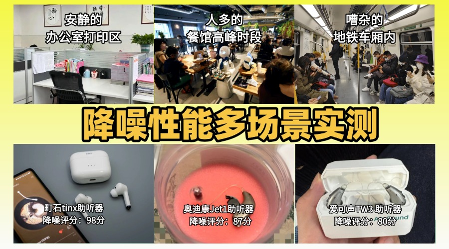 测评方法:这次测试,我选择了办公室打印区、餐馆高峰时段与地铁车厢内进行降噪测试,使用声压计记录噪声强度,并观察三款助听器在高噪环境中的降噪反应。打分重点为“恒定噪声处理能力”、“突发噪声屏蔽效果”、“背景噪声持续干扰感”。