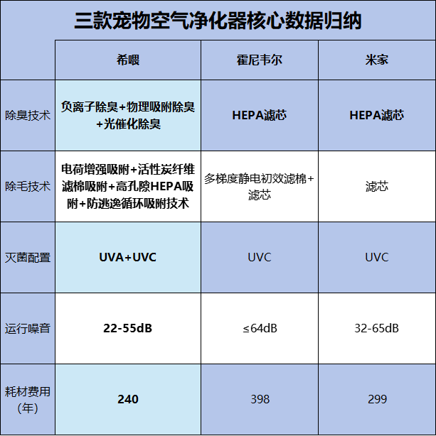 三款猫用空气净化器核心数据对比图:
