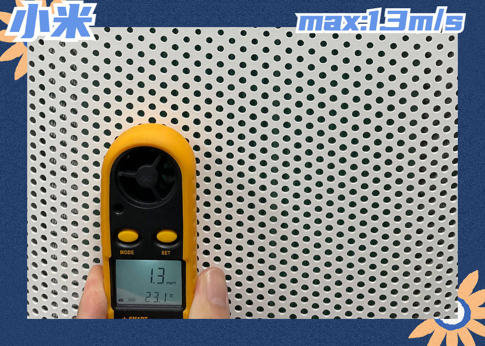 实测风速1.3 m/s,风道设计较开放,空气循环分散,集中净化力偏弱,适合40㎡以下空间。对于活动频繁的宠物家庭,清洁效率略显不足。
