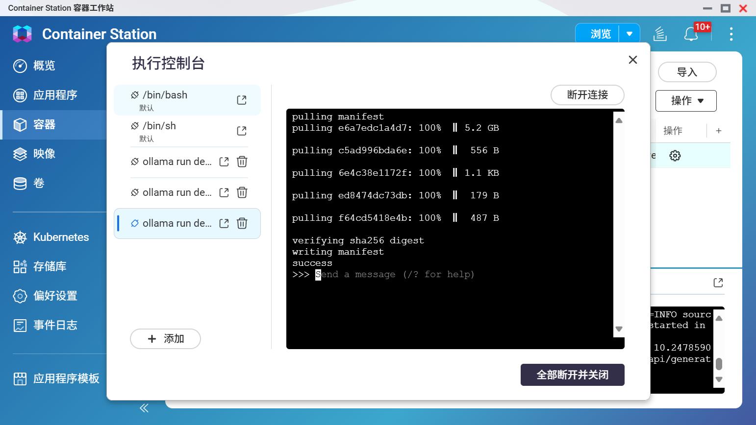 下载完成之后重启容器,然后在控制台执行命令,并且,之后每次使用模型都需要先执行命令。