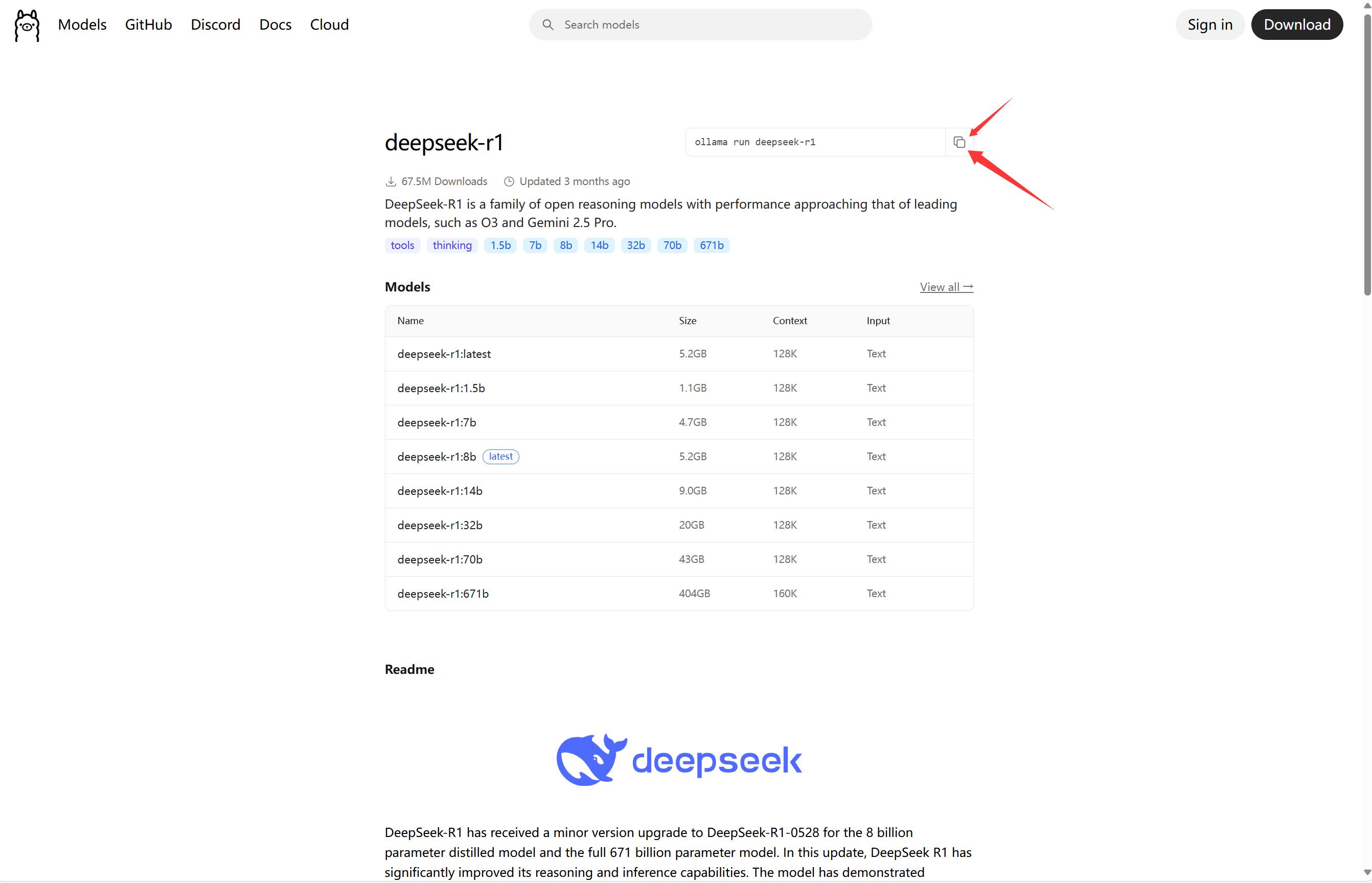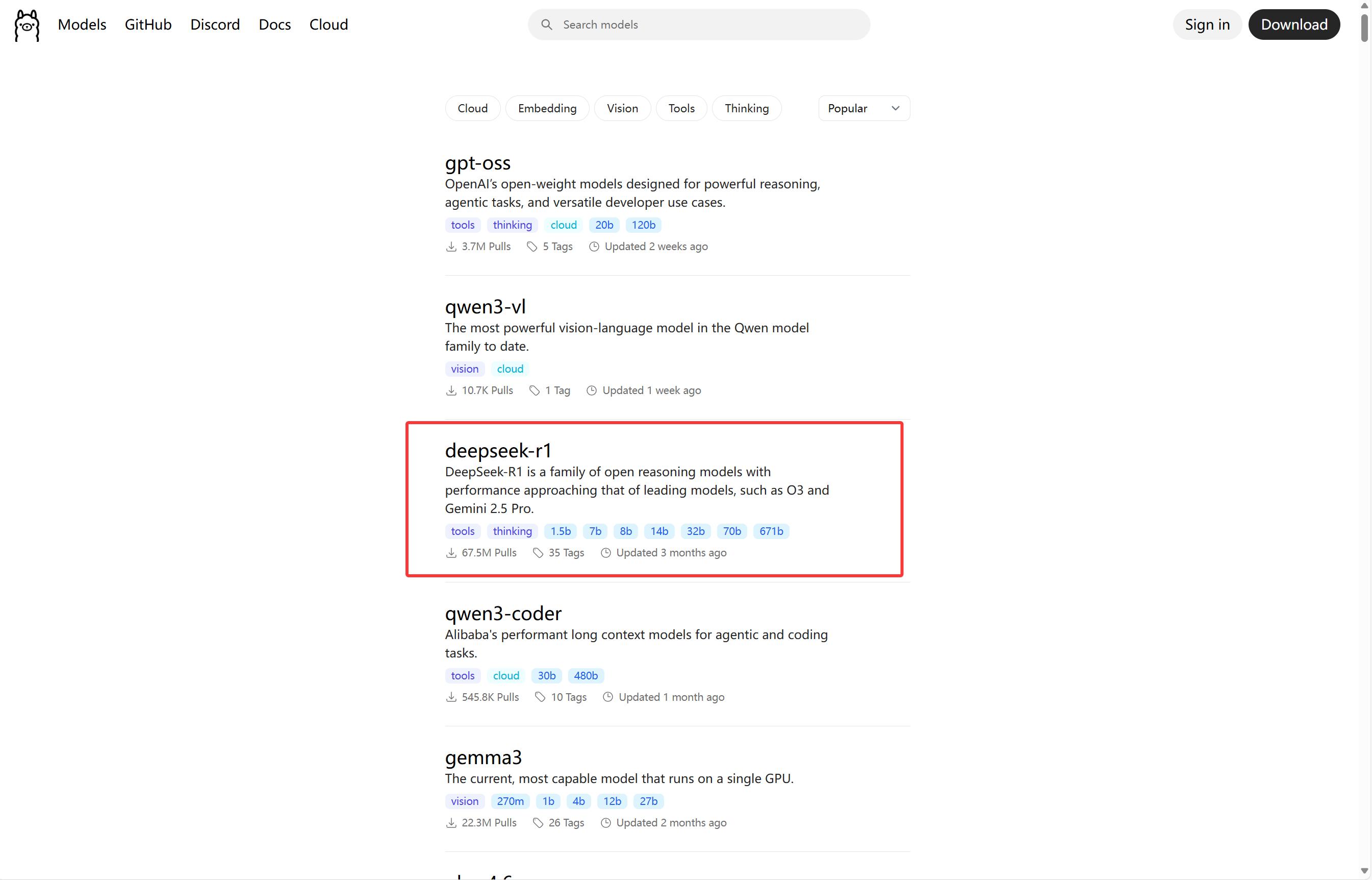打开Ollama模型库(https://ollama.com/search),找到所需模型并复制拉取命令,例如选择: