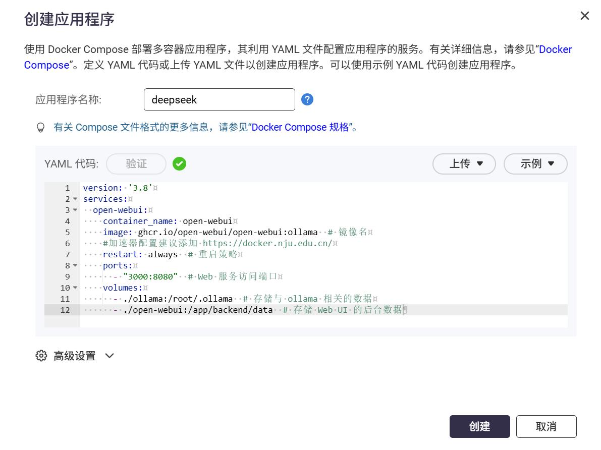 在YMAL代码窗口输入以下Open WebUI的Docker Compose配置文件,验证通过后点击创建即可。