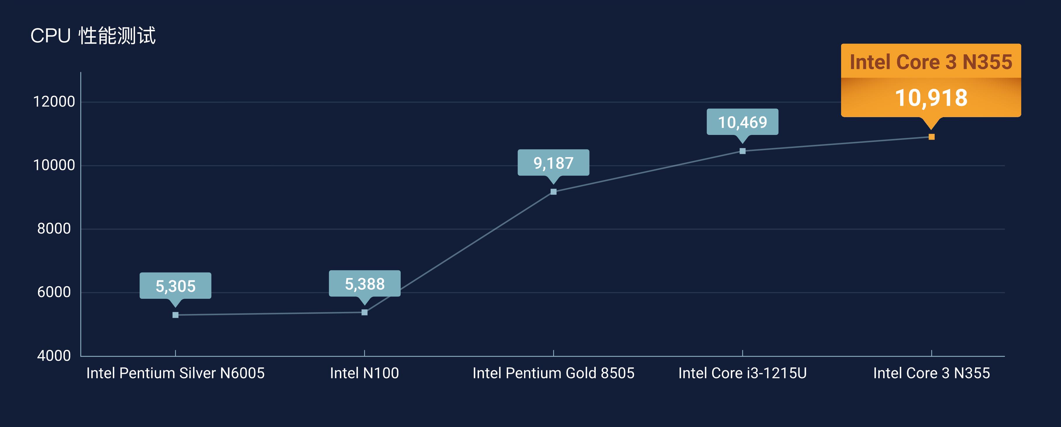 威联通Qu405最重要的升级是它搭载了新一代Intel酷睿N355处理器,拥有8核心8线程,最大睿频频率3.9 GHz,6MB高速缓存。性能表现如下图所示,N355处理器的综合性能大约是N6005、N100的2倍,比目前主流的高端NAS处理器intel Pentium Gold 8505提升了约19%,提升非常显著。