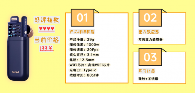 bebird是可视挖耳勺领域比较早期入局的品牌之一,产品主打入门级日常使用,整体偏向基础功能普及,造型和配置都以够用、易上手为主,主要面向预算不高、只做简单耳道清洁的普通用户,功能和体验都偏向基础实用路线。