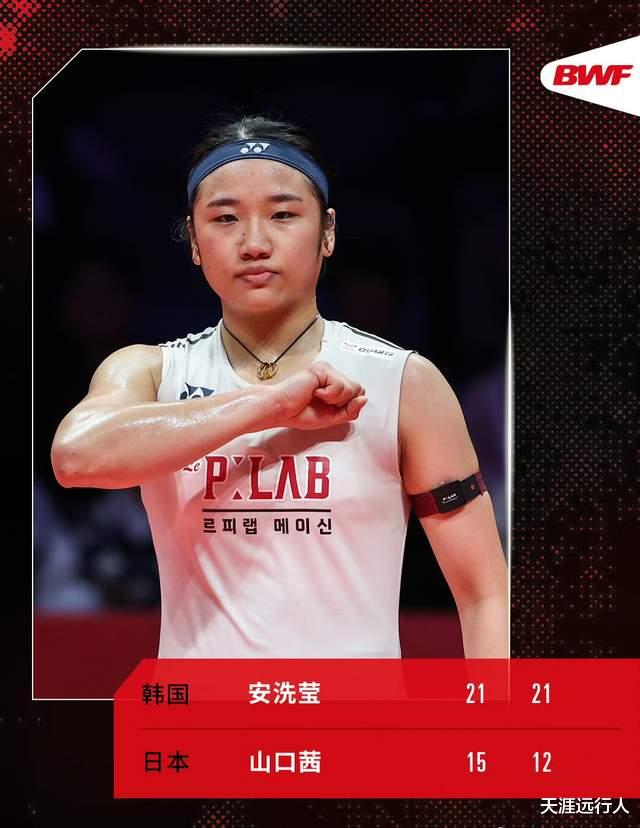 世一姐安洗莹,以21-15, 21-12,赢下老对手、三届世锦赛冠军山口茜,晋级女单决赛,达成交手三连胜,把双方历史交手记录改写成17-15,决赛静待刚刚5战胜因达农的王祉怡。