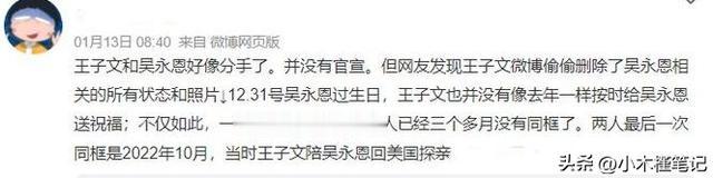 去年12月31是吴永恩的生日,王子文并未送祝福,而且删除了很多与吴永恩的合影,由此来看,参加过综艺后,两人就已经分手了。