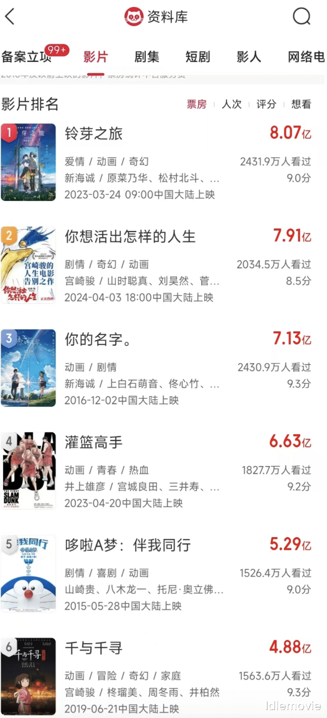最高的是8.07亿的《铃芽之旅》,接下来是7.91亿的《你想活出怎样的人生》和7.13亿的《你的名字》。