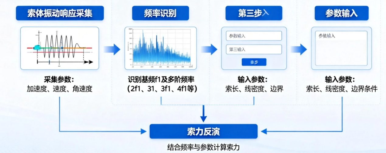 振动法通过采集索体振动响应(加速度、速度或角速度),识别基频 f1及多阶频率(2f1、3f1、4f1等),再结合索长、线密度、边界条件等参数反演索力。