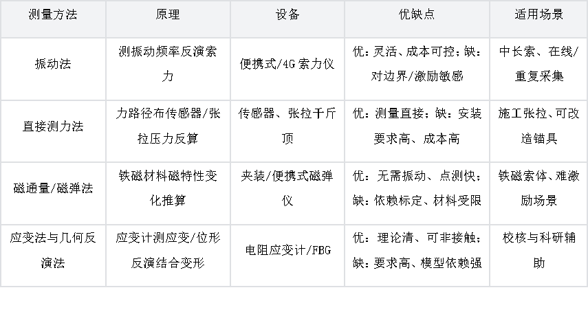 其中,工程上最常用的是振动法、直接测力法与磁通量法(磁弹法);应变法与几何法更常用于科研、校核或辅助诊断。