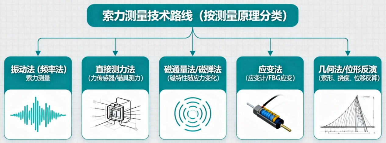 直接在力传递路径上测量力值:在锚具、连接件或关键构件处布设力传感器,或利用张拉设备压力与力关系反算索力。