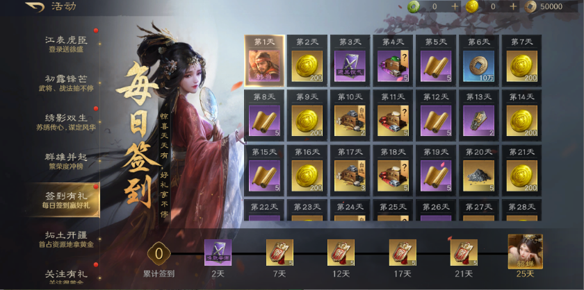 《三国:谋定天下》最让人惊喜的就是对新人满满的诚意,新人刚创建角色就能领到全服预约奖励,不仅有强力橙色武将徐盛,还有大量黄金和求贤令等实用资源,推进剧情到第六章就能免费拿到橙色武将蔡文姬。上线就开七日狂欢新人活动,每天完成简单任务就能拿丰厚奖励,第二天直接就能领到橙色武将孙策,前七天登录就免费送一百多次抽卡机会,还有数千黄金和多个橙色战法,新人起步就能凑出战斗力不错的队伍,完全不用为初始资源发愁。
