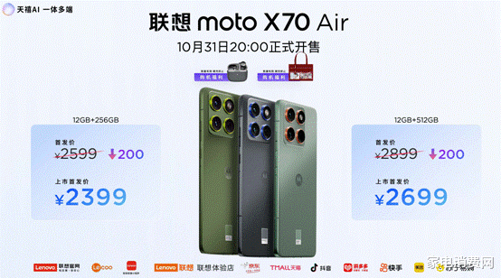 价格方面,联想moto X70 Air AI手机售价2599元起,现已全渠道正式开售,首销福利限时优惠仅2399元起,还可享国补和平台补贴等多重优惠。