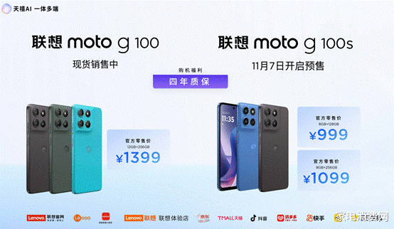 联想moto g100 AI手机和联想moto g100s AI手机,均配备LCD阳光护眼屏和7000mAh超大电池。其中,联想moto g100 AI手机售价1399元起,联想moto g100s AI手机售价999元起。