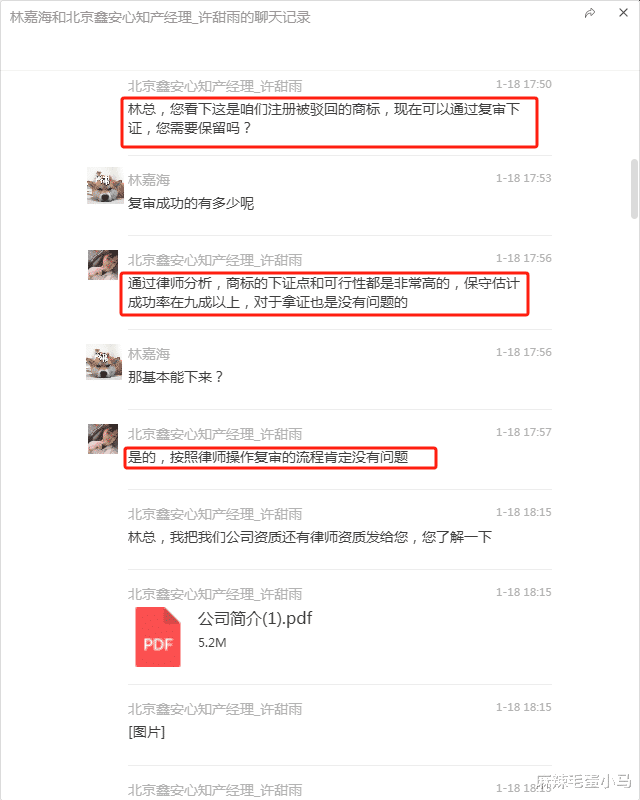 鑫安心的销售经理许甜雨在向我推销商标复审服务时,声称其公司拥有“双证双资质金牌律师”,并承诺“复审成功率九成以上”“操作过大量疑难案件”。她还多次强调,其律师“经常受邀参加商评会议”“熟悉审查标准”。为了让我相信,她发来了多份“成功案例”的商标复审决定书截图。