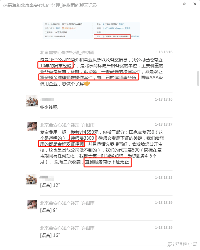 大家好,今天我想通过自己的亲身经历,曝光一家名为“北京鑫安心知识产权代理有限公司”(以下简称“鑫安心”)的商标代理机构。该公司在与我沟通商标复审业务过程中,存在严重不实宣传、盗用同行成功案例、夸大成功率等欺骗行为,目前已导致我遭受经济损失,特此提醒大家警惕类似套路!