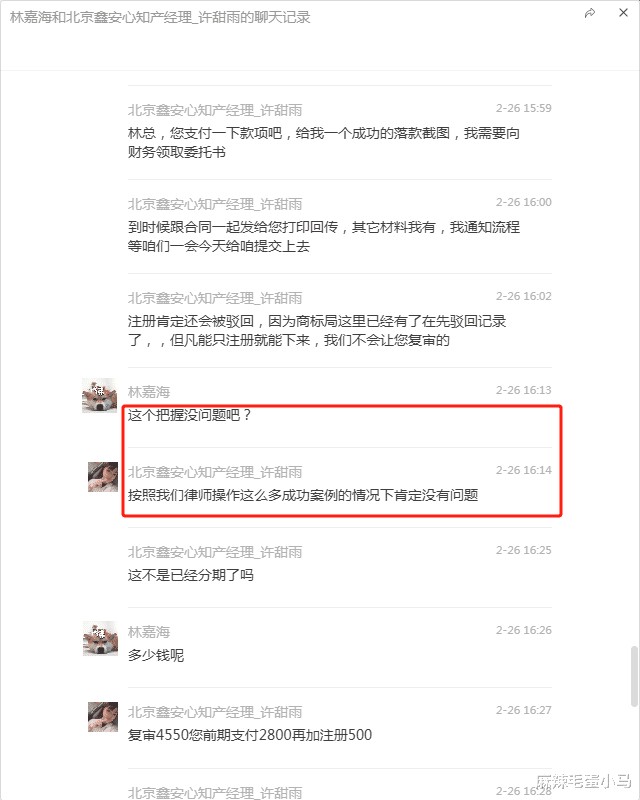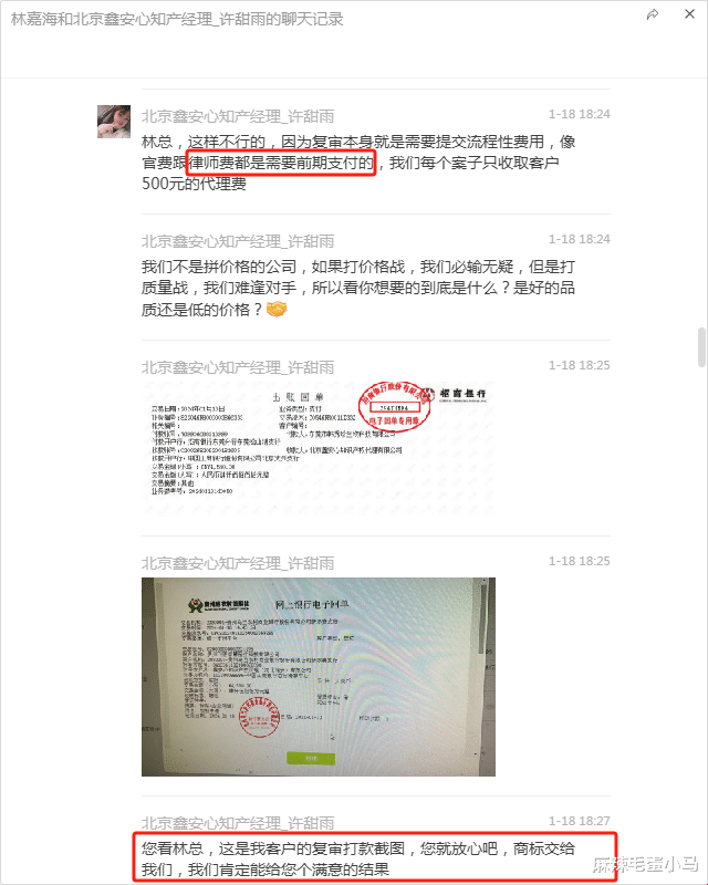在沟通中,许甜雨多次催促我支付费用,声称“复审+注册”共计4550元,并承诺“无二次收费”。我先后支付了2800元和500元,但她随后又提出“分期付款”“需支付尾款”等要求,态度急迫,令人怀疑其真实意图。