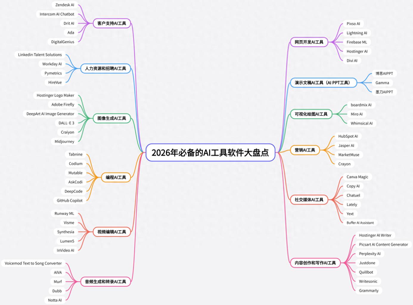 网页开发AI工具:Pixso AI、Lightning AI、Firebase ML、Hostinger AI、Divi AI演示文稿AI工具(AI PPT工具):博思AIPPT、Gamma、墨刀AIPPT可视化绘图AI工具:boardmix AI、Miro AI、Whimsical AI营销AI工具:HubSpot AI、Jasper AI、MarketMuse、Crayon社交媒体AI工具:Canva Magic、Copy AI、Chatuel、Lately、Yext、Buffer AI Assistant内容创作和写作AI工具:Hostinger AI Writer、Picsart AI Content Generator、Perplexity AI、Justdone、Quillbot、Writesonic、Grammarly客户支持AI工具:Zendesk AI、Intercom AI Chatbot、Drit AI、Ada、DigitalGenius人力资源和招聘AI工具:Linkedin Talent Solutions、Workday AI、Pymetrics、HireVue图像生成AI工具:Hostinger Logo Maker、Adobe Firefly、DeepArt AI Image Generator、DALL·E 3、Craiyon、Midjourney编程AI工具:Tabnine、Codium、Mutable、AskCodi、DeepCode、GitHub Copilot视频编辑AI工具:Runway ML、Visme、Synthesia、Lumen5、InVideo AI音频生成和转录AI工具:Voicemod Text to Song Converter、AIVA、Murf、Dubb、Notta AI