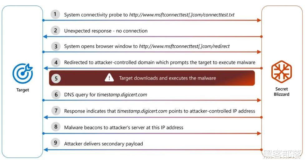 这场网络行动已持续数年。它利用了该国的ISP,这些ISP有义务为俄罗斯政府服务。通过控制ISP网络,微软追踪名为“秘密暴雪”(Secret Blizzard)的威胁组织,将自身定位在目标使馆与其连接的终端之间,这是一种被称为中间人攻击(Adversary in the Middle, 或 AitM)的形式。这种位置使“秘密暴雪”能够将目标引导至看似已知且可信的恶意网站。