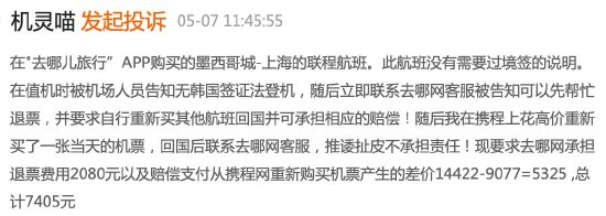还有消费者5月投诉表示,自己在去哪儿APP购买的墨西哥城-上海的联程航班,没有需要过境签的说明。在值机时被机场人员告知无韩国签证无法登机,去哪儿网客服称可以先帮忙退票,消费者自行重新买其他航班回国并可承担相应的赔偿,但之后公司却推诿扯皮不承担责任。