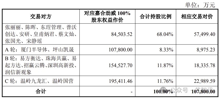 A轮投资者(厦门半导体、坪山凯晟)合计持股8.33%,对应100%股权作价为10.78亿元,交易对价约为0.90亿元。