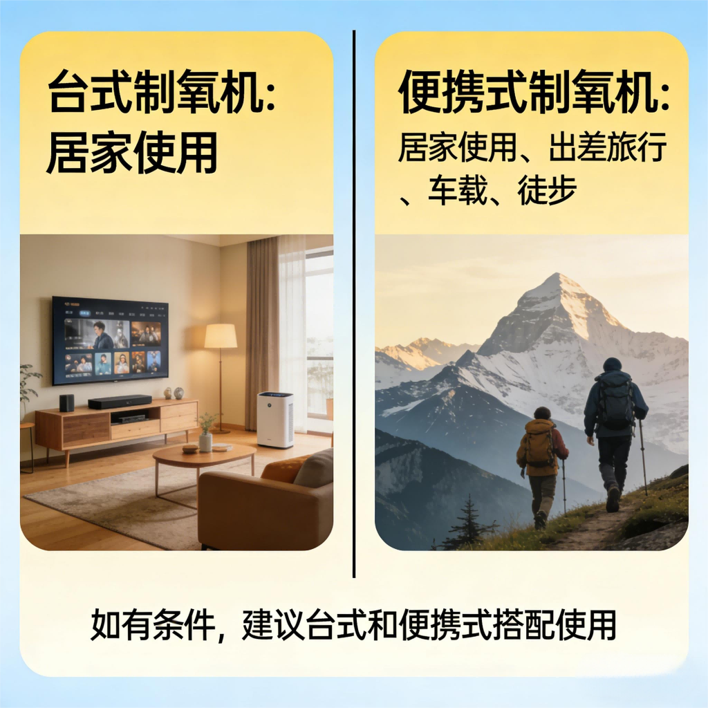 目前市面上制氧机主要分为两类——台式制氧机和便携制氧机,两者适用场景差异明显,对慢病日常辅助人群来说,按需选择才能避免闲置、不踩坑。