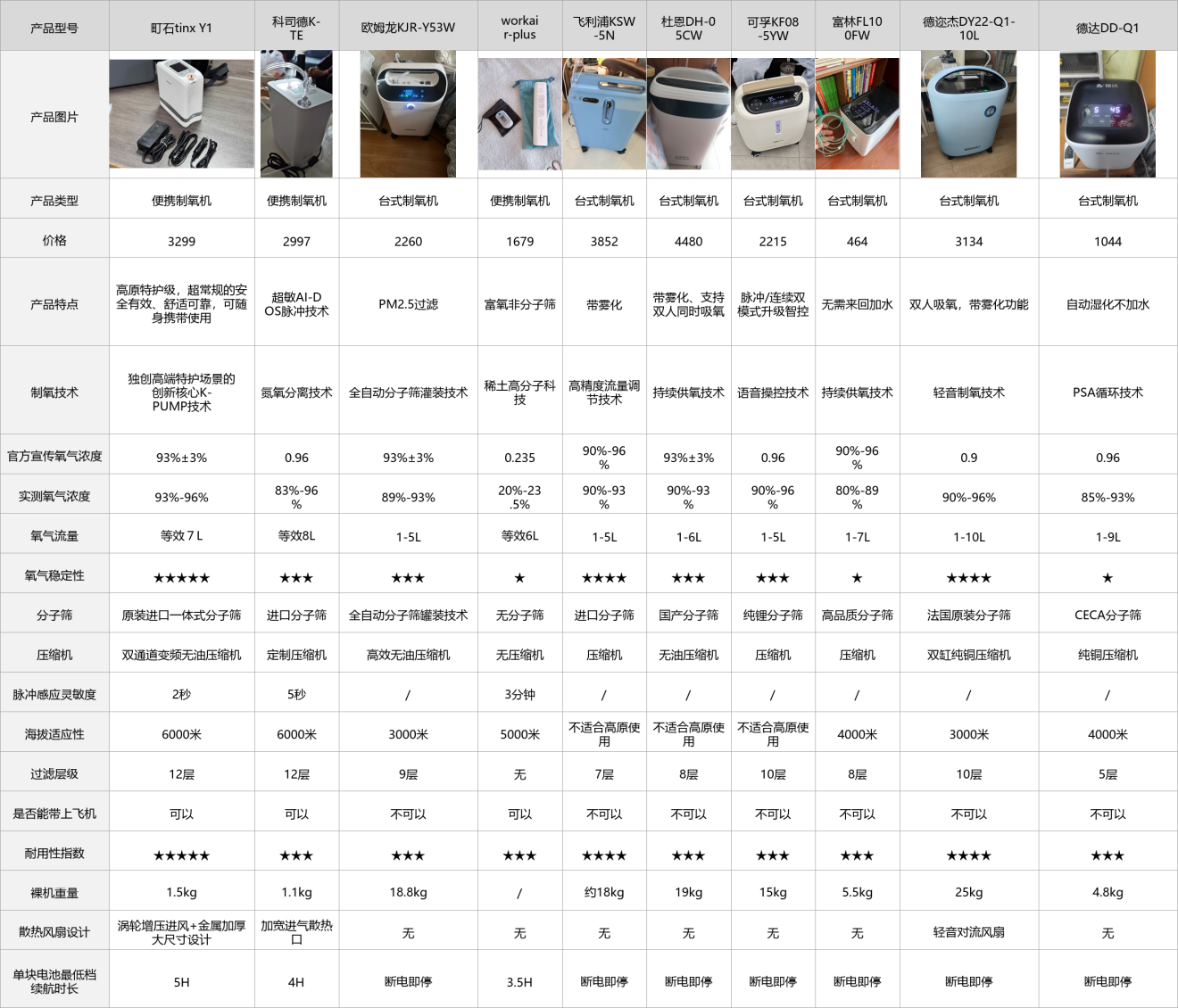看了前面的科普和选购技巧,大家对制氧机已经有了基本了解。为了让大家快速看清这10款机器的核心差异,也方便大家对照挑选,我整理了一份实测参数对比表。