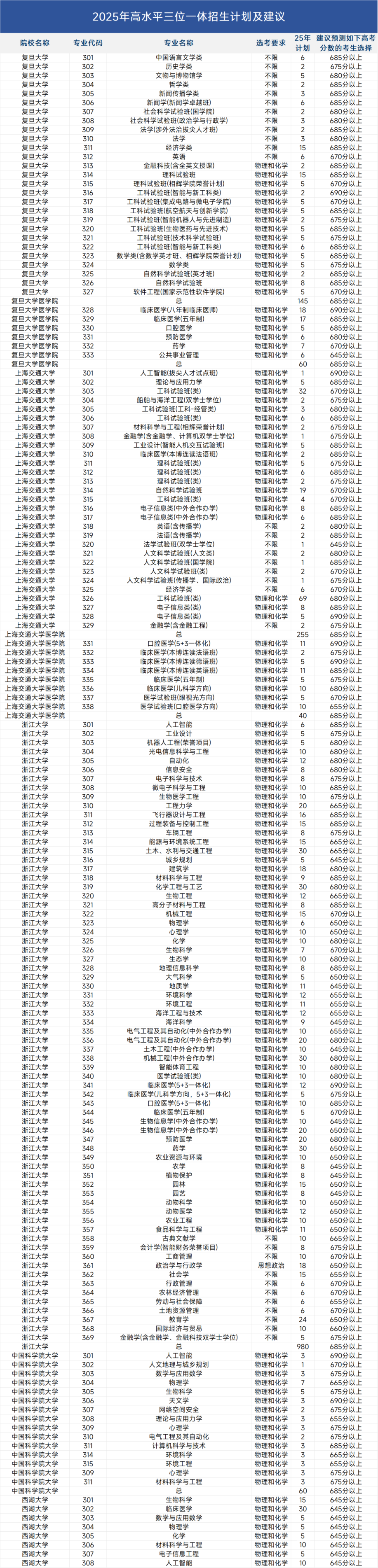 复旦、上交、浙大、国科大、西湖大学五所高校的三位一体招生,报名阶段即确定具体专业,按综合分录取。