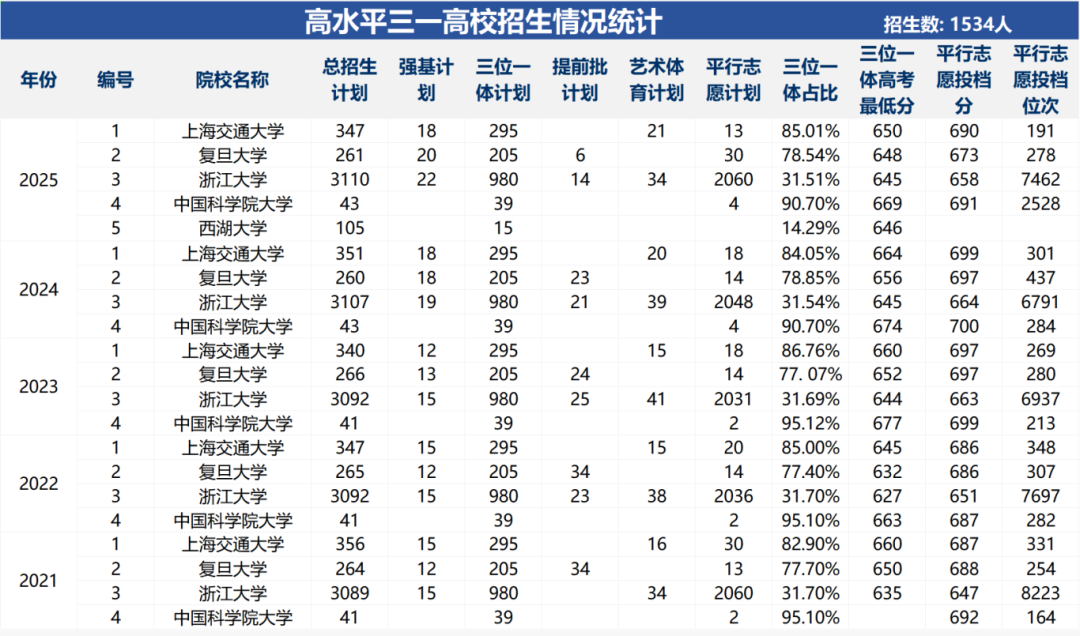 2025 年高水平三位一体五校总招生 1534人,各校核心数据如下: