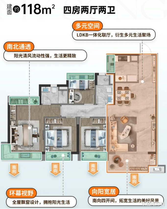 如果还想进一步升阶,这套南向四开间118㎡的四房,让生活更加从容。