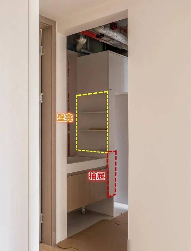 第三步:防溅水、好清洁,细节决定体验感很多人担心洗漱台和洗衣柜挨太近会溅水,业主的解决办法很聪明:把洗漱台的岩板台面向上延长了10公分,形成一个小“挡水沿”,水根本溅不进壁龛;洗衣柜底部特意悬空20公分,扫地机器人能直接钻进去,打扫卫生再也不用挪柜子。