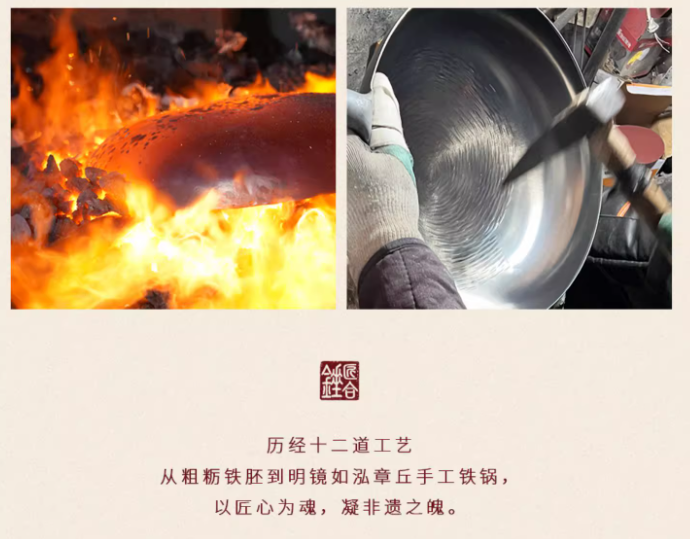 章丘手工铁锅的传奇,藏在匠人的老茧里,响在锻打的铿锵中,更刻在代代相传的十二道核心工序里。从 “盘炉” 升温时的火候把控,到 “打坯” 定型时的力道拿捏;从 “拔边” 修形时的精雕细琢,到 “回火” 增韧时的耐心等待,单是锻打就分 “冷锻”“热锻”,三万余次抡锤起落,只为让锅身浮现均匀细密的锤纹 —— 那是铁与火碰撞的勋章,更是 “物理不粘锅” 的核心密码:锤纹越密,储油锁热能力越强,炒出的菜自带醇厚 “锅气”。