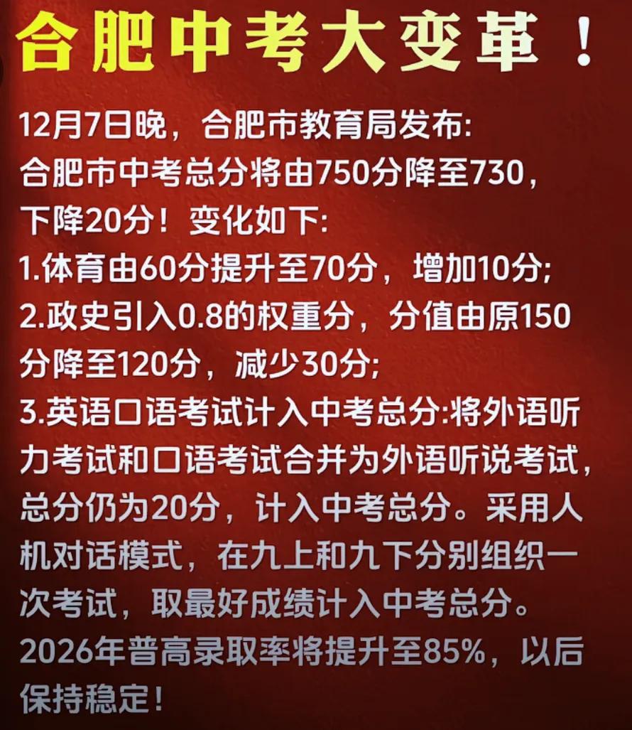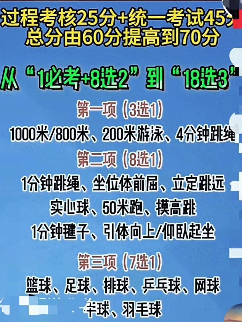 朋友参加家长会回来,他家娃是合肥某中学初一学生。家长会上听说了这项关于中考的改革。朋友心里直打鼓,她家儿子刚上初一,平时就爱偷懒,体育更是弱项。这次体育分值涨到70分,还有25分的过程性考核,从初一就开始算!