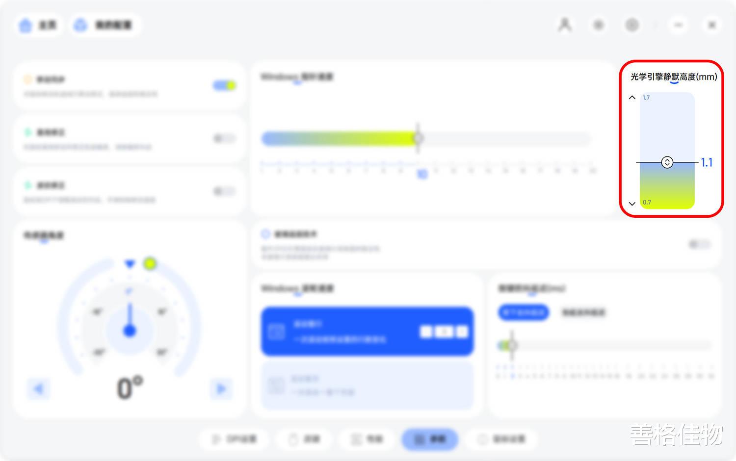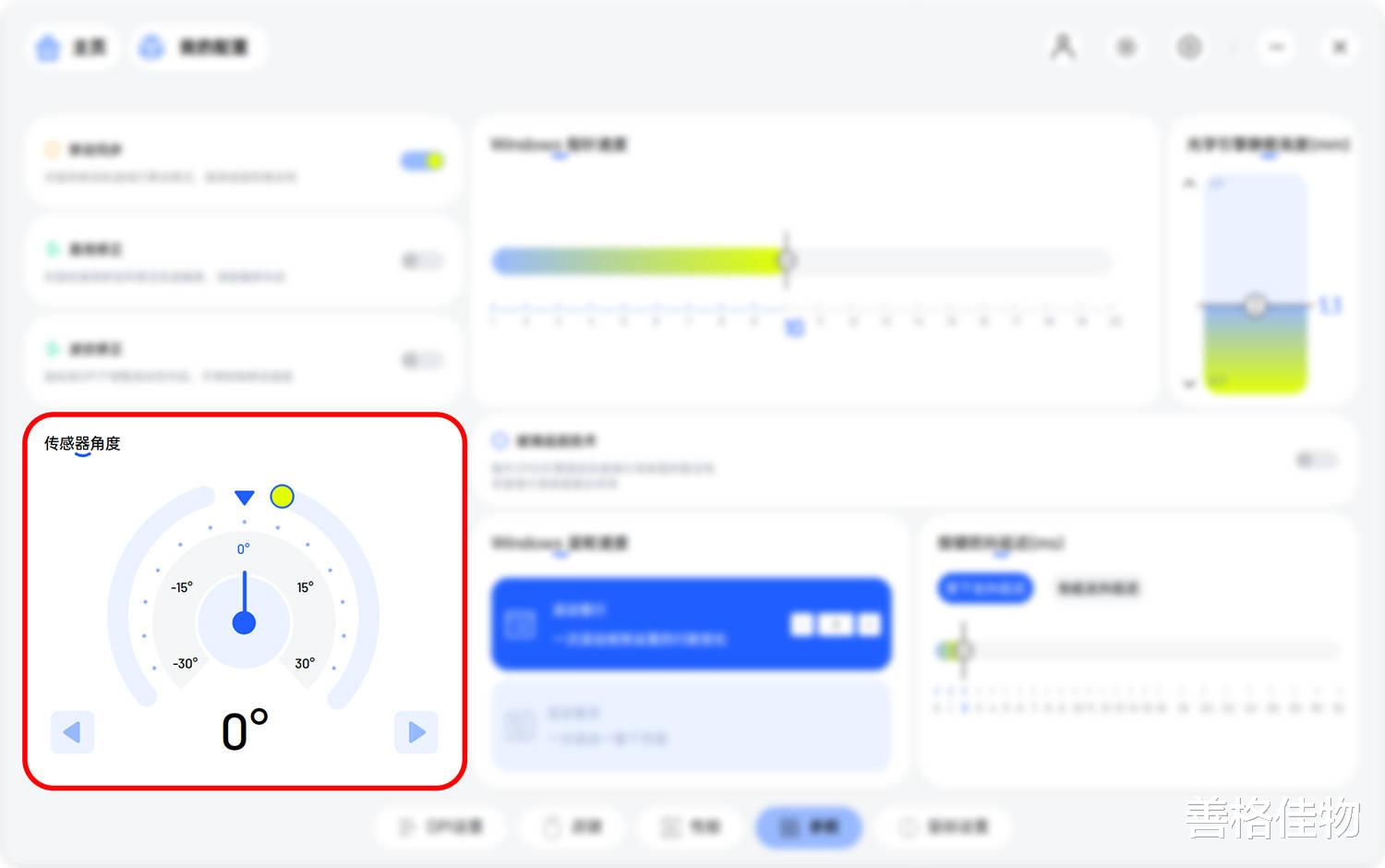 另外还有一个比较实用的功能是传感器角度调节,这对与习惯斜握鼠标的用户来说很实用,可以纠正握姿偏差,确保光标移动与实际手臂动作一致的功能,最常见的就用场景就是在FPs游戏中减少拉枪时的轨迹偏差。