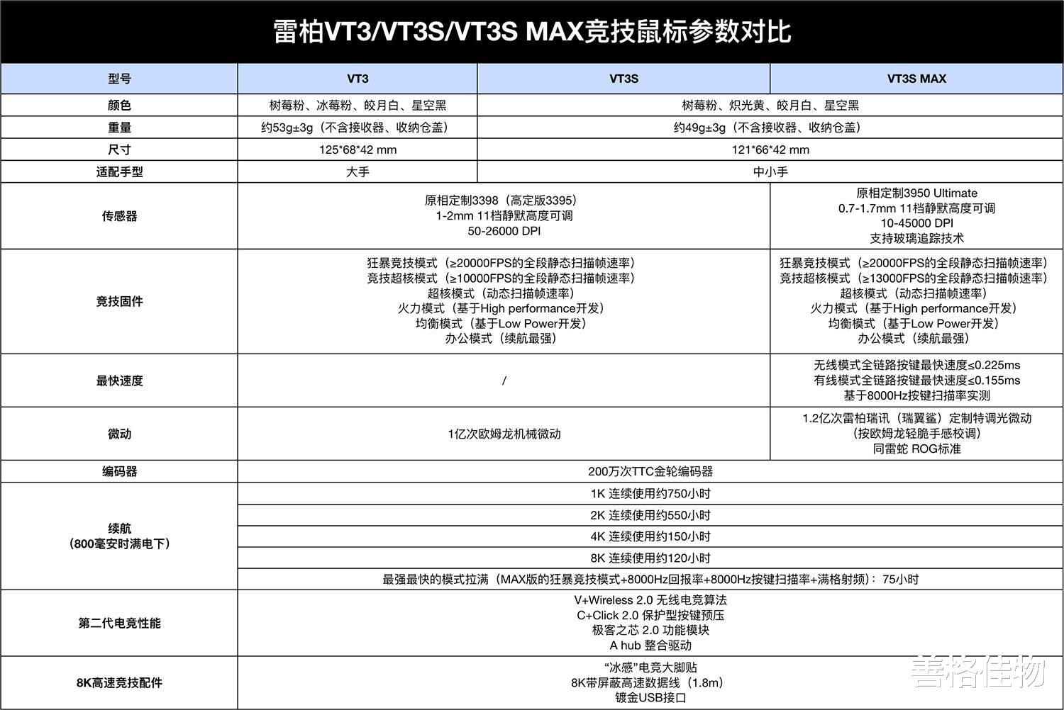 先来看一下这三款鼠标(VT3、VT3s、VT3s MAX)的参数对比,主要区别在于尺寸、传感器、微动,以及竞技固件(性能模式)。
