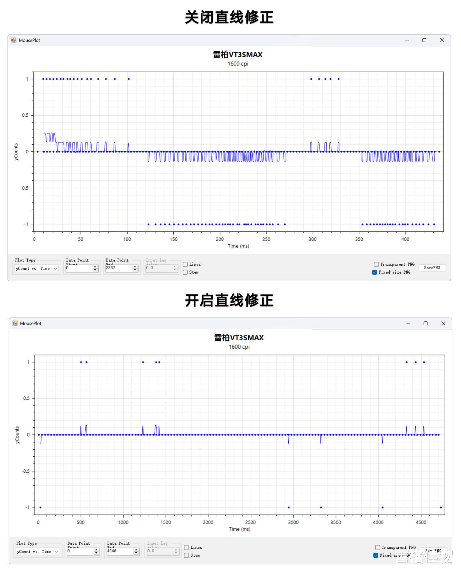 FPS类游戏可以开启直线修正来锁定爆头线,如果是RTS或者MOBA这类需要精准点选的游戏,最好还是关闭。MouseTester的yCount vs. Time可以用来测试直线修正的功能,从结果来看,结果还是相当不错的。