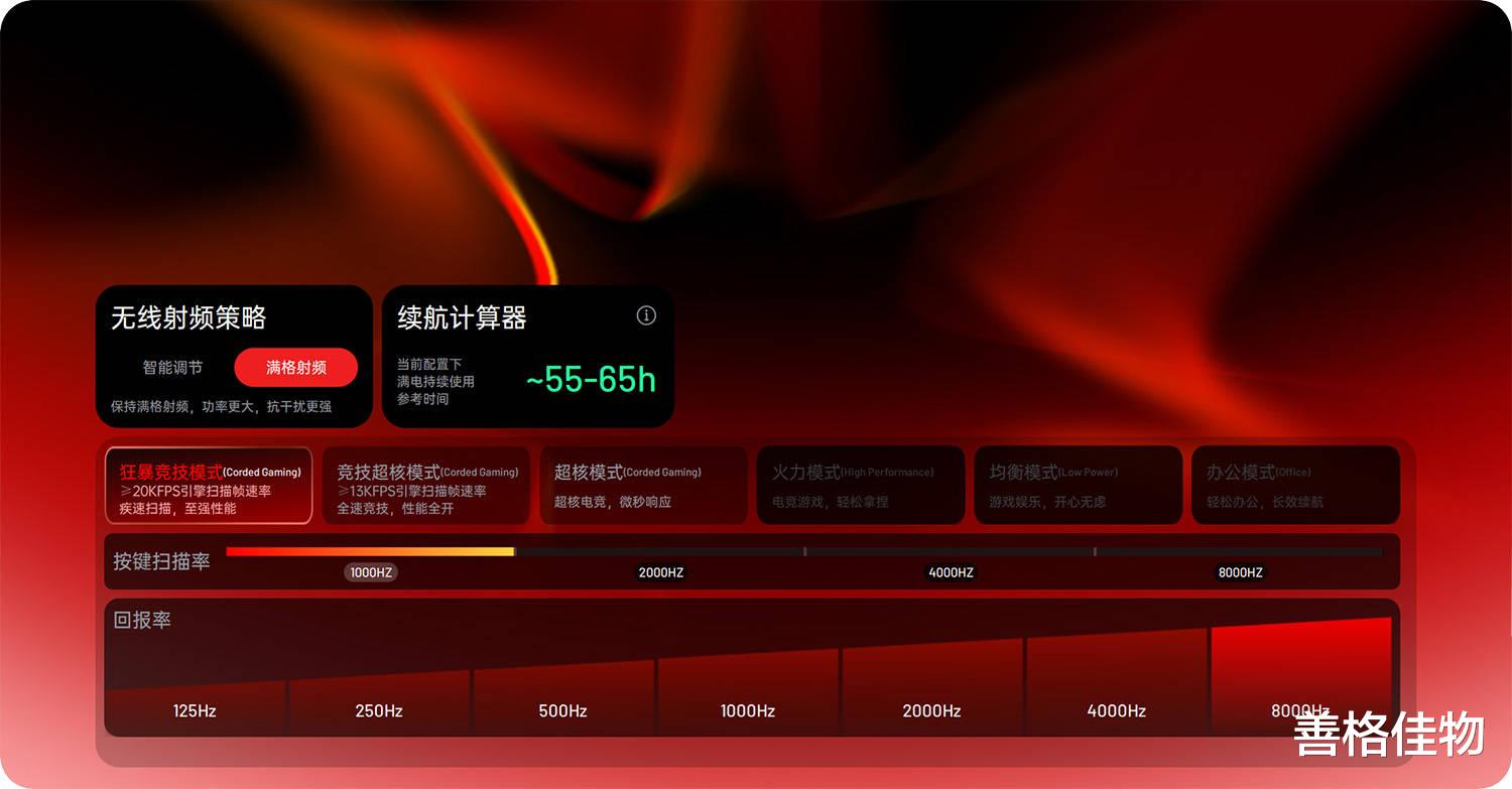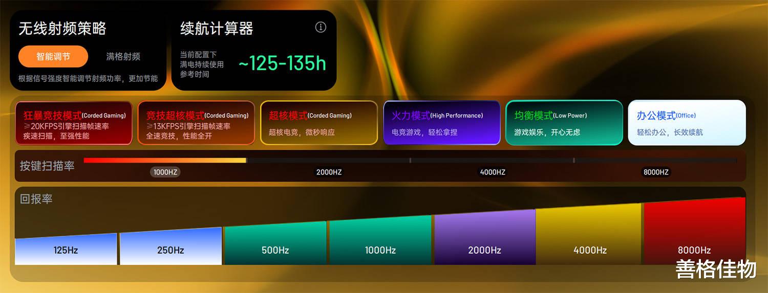 针对不同的使用场景,VT二代技术平台给出了7档不同回报率和无线射频功率搭配的组合式方案,并且计算了续航时间,比如办公模式下,智能调节射频功率+125Hz回报率就能够满足,此时可以获得最大的续航效果,大概在980-1000小时之间,按每天8小时用量计算,差不多可以用4个月左右,这个续航能力是相当恐怖。最高性能,也就是无线射频全功率满格输出,回报率为8000Hz,开启狂暴竞技模式,使用时间也能达到70-80个小时,差不多8天左右。