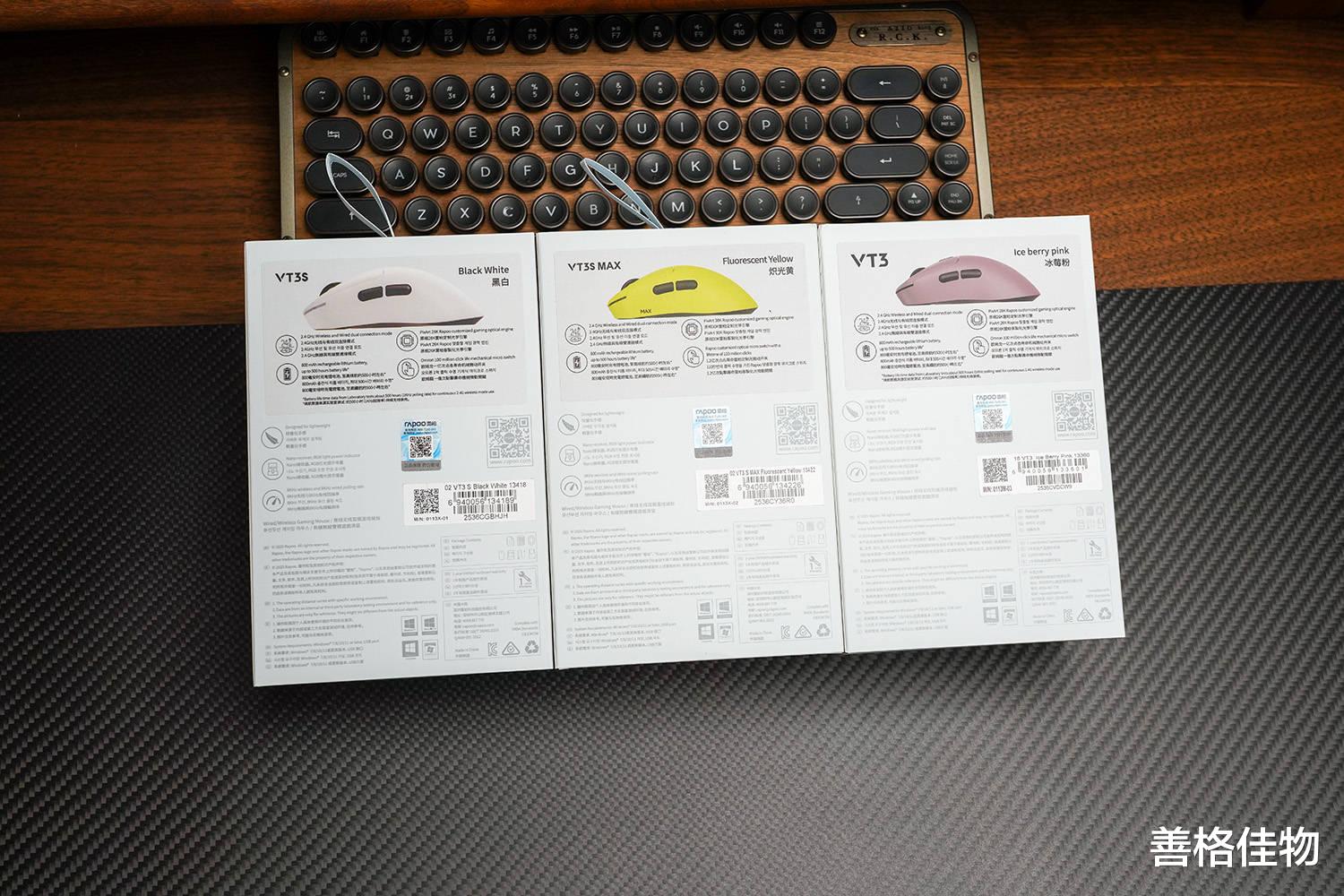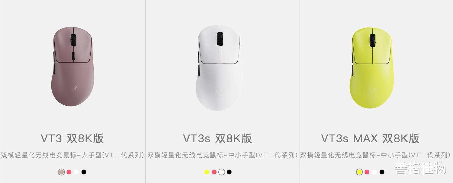 每款鼠标都有4种配色,VT3是冰莓粉、树莓粉、皎月白、星空黑,VT3s和VT3s MAX是炽光黄、树莓粉、皎月白、星空黑,其中树莓粉处于长年缺货状态,基本可以忽略了。