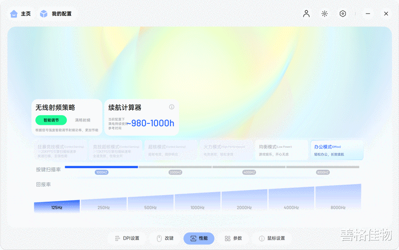 详细说一下这几种模式吧,雷柏VT二代平台一共给出6种场景模式:办公模式、均衡模式、火力模式、超核模式、竞技超核模式、狂暴竞技模式,鼠标的输出性能依次递增。不同的回报率,可开启的模式是不同的,所有模式、所有回报率下,无线射频的功率都可以在“智能调节”和“满格射频”间切换,在满足使用需求的前提下,选择较低的性能模式、回报率、射频功率可以提高鼠标的续航时间。