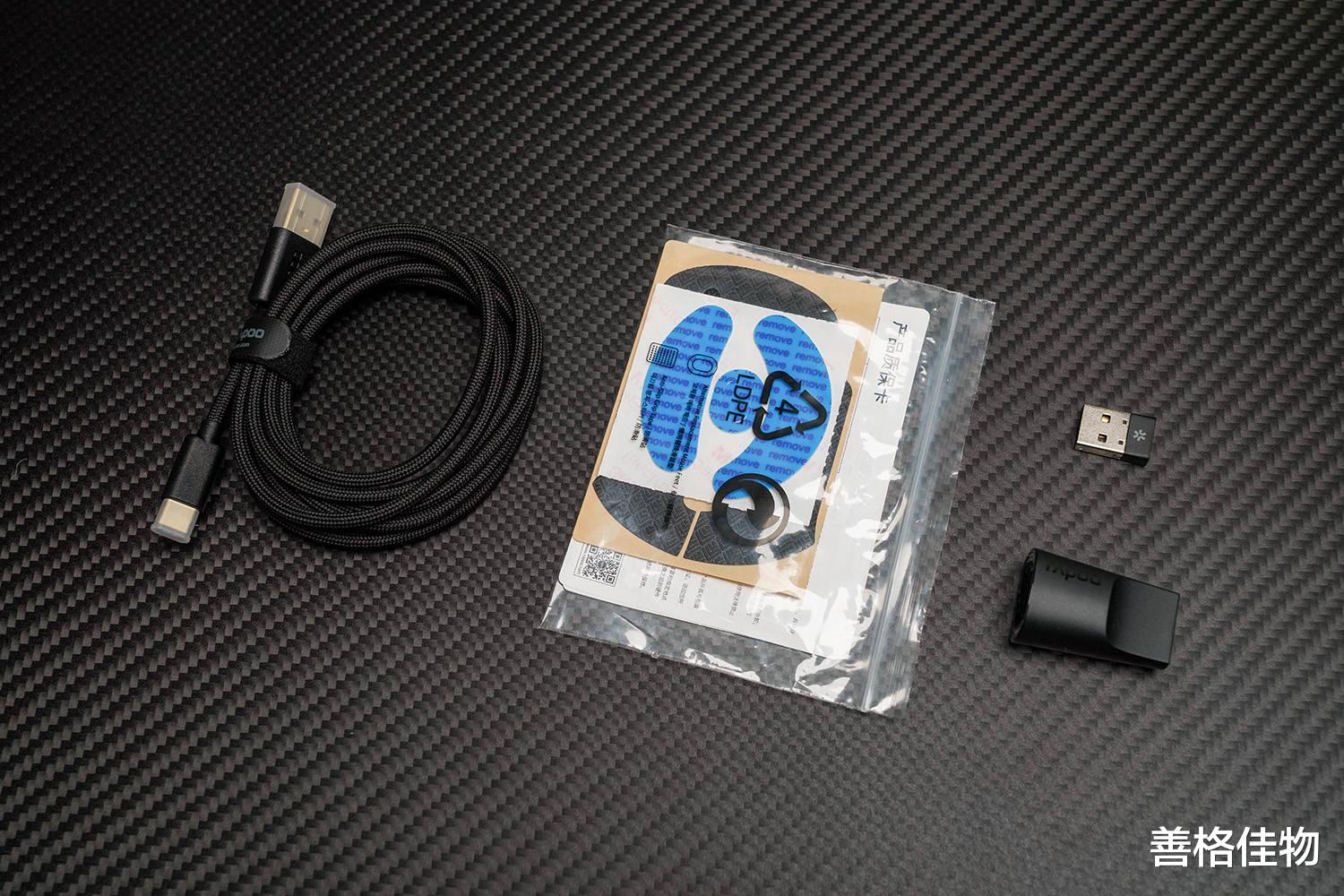 三款鼠标的配件相同:除了说明书、保修卡、备用脚贴、防滑贴,还一根1.8米长的编织数据线,给走线留有足够的余量,另外还有一个USB转换器和一个Nano 8K微型无线接收器。
