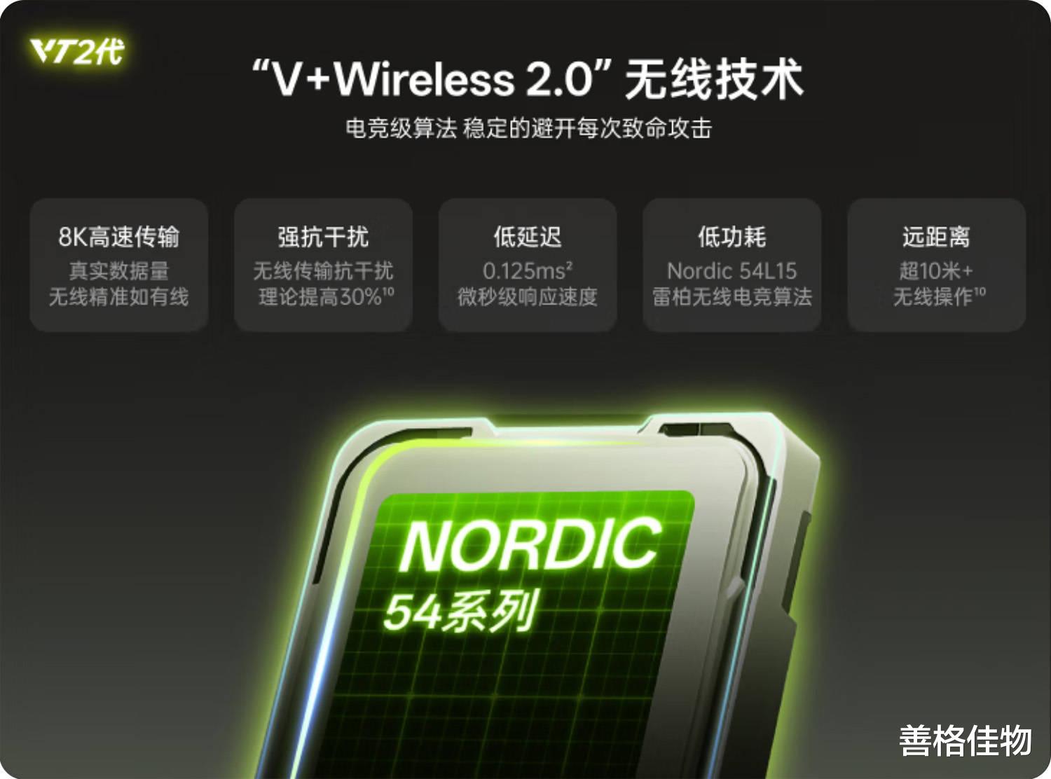 雷柏的VT二代都包含了哪些重点技术?首先是芯片,雷柏VT二代系列搭载了NORDIC 54系列芯片,相比NORDIC 52,主频和无线传输带宽都提高了2倍,但功耗却降低了50%,可以简单的理解为性能翻倍,耗电减半,大幅度提高了续航性能。另外就是雷柏自家的V+Wireless 2.0技术,低延迟、强抗干扰,回报率达到了有线无线原生双8K。