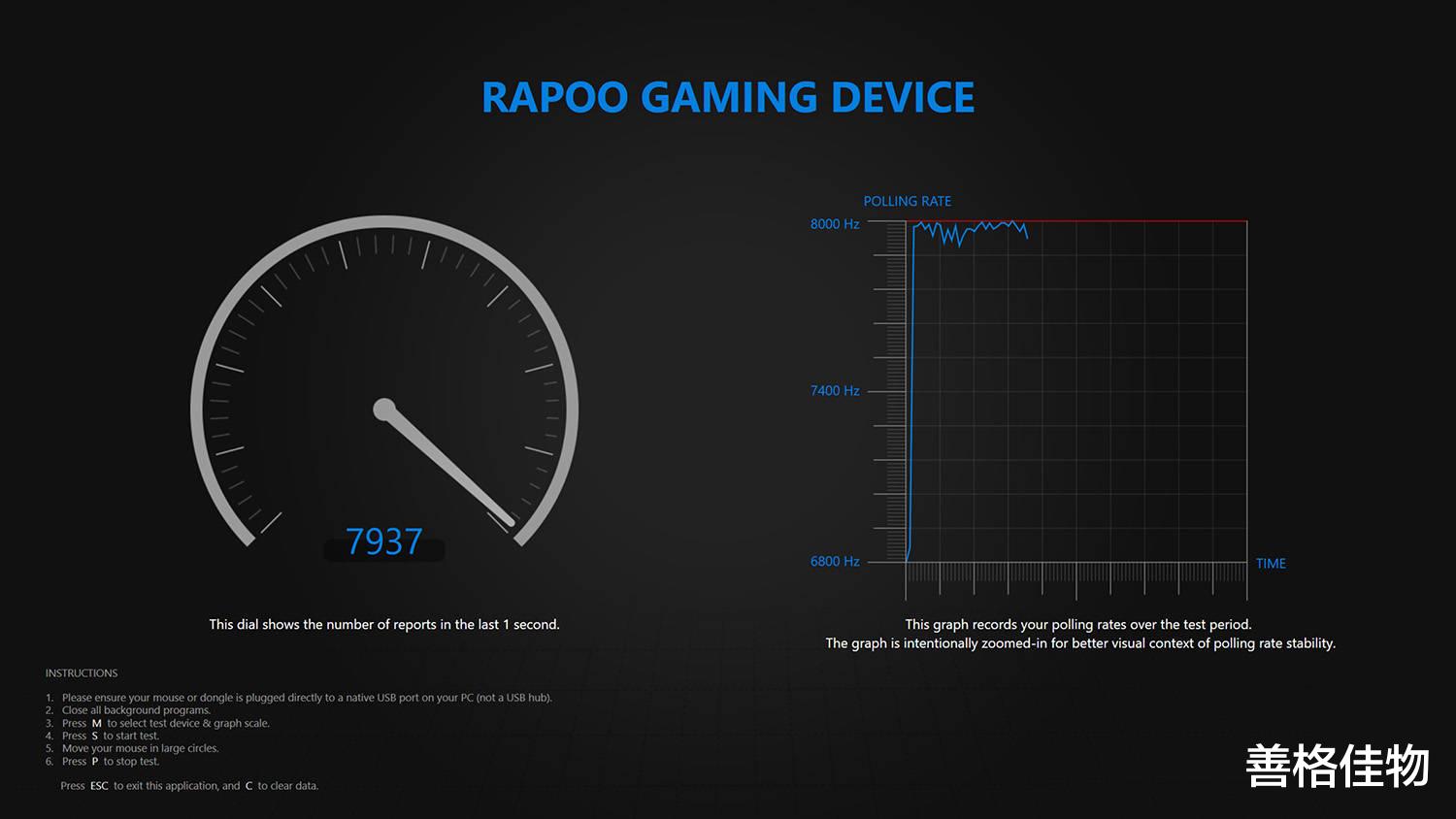 常用的DPI基本都在4000以下,所以在1600和3200这两个档位进行回报率测试,无线射频自动调节,超核模式下,回报率可轻松飙到8000Hz。