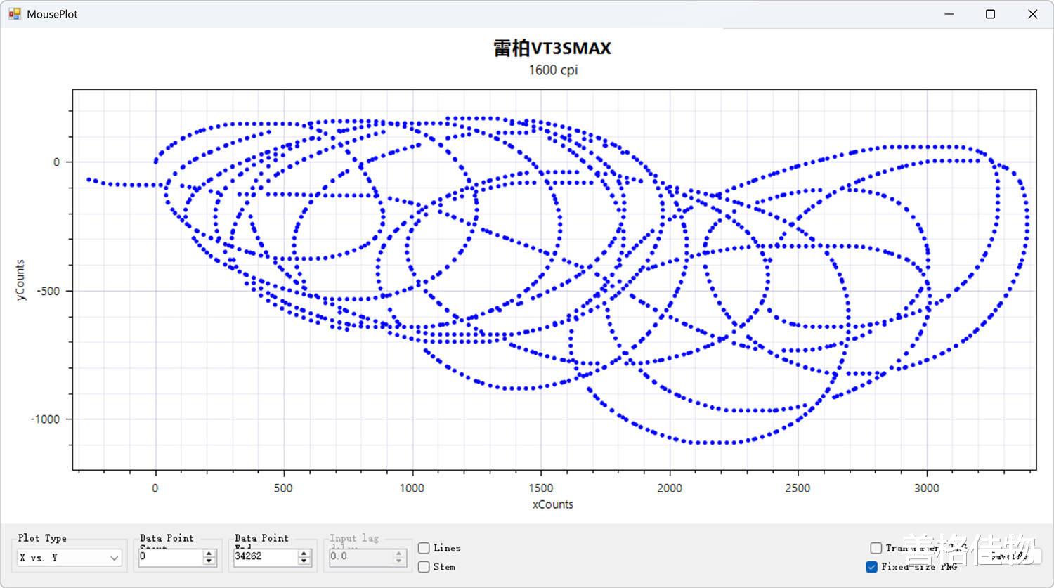 MouseTester的X vs. Y可以测试鼠标的丢帧(IPS)情况,鼠标做划圆操作,点阵图结果与鼠标的运行轨迹基本一致,圆滑流畅,没有丢帧,说明鼠标本身的IPS是足够高的。