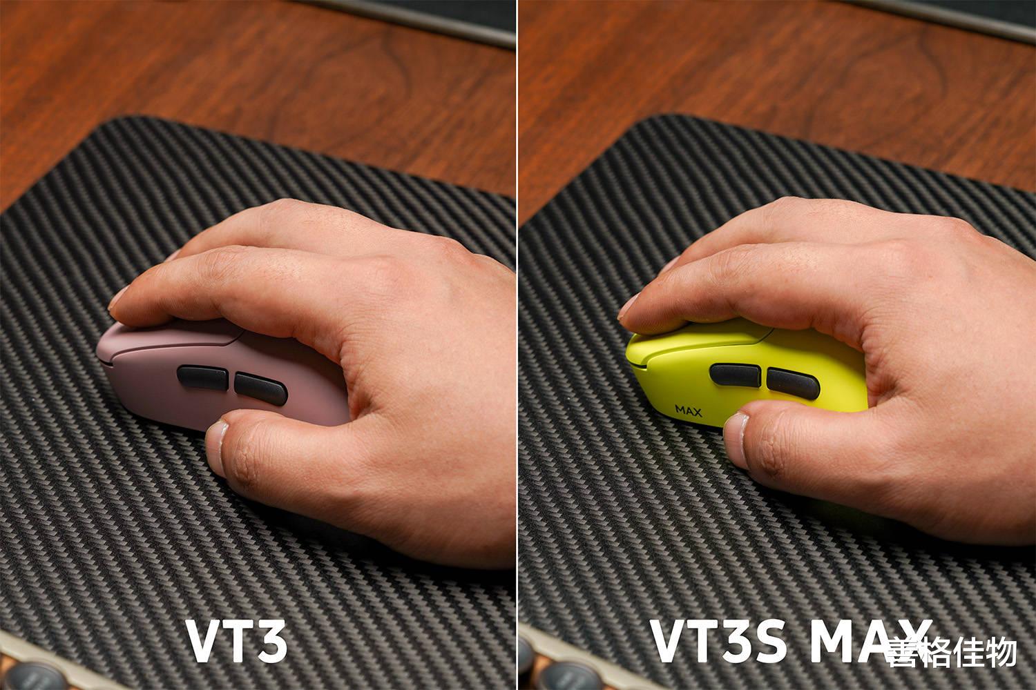 VT3和VT3s、VT3s MAX的区别是尺寸大小,VT3的三维是126.2*68.2*42.4 mm,适合大手用户,VT3s和VT3s MAX的三维是121*66*42 mm,适合中小手用户,并且VT3s和VT3s MAX取消了顶部的DPI按键,零冗余设计,简洁清爽,更加电竞化。
