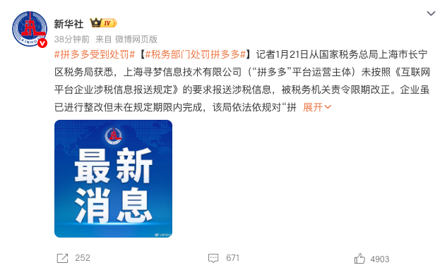 2026年1月21日,新华社报道,国家税务总局上海市长宁区税务局披露,拼多多运营主体上海寻梦信息技术有限公司因未按规定报送涉税信息,且经责令限期改正后仍未按时完成整改,被依法处以10万元罚款,这也是《互联网平台企业涉税信息报送规定》实施以来的典型案例之一。
