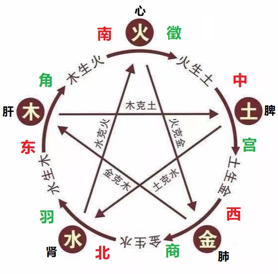 角徵宫商羽,配五行(木火土金水)五方(东南中西北)。角属木,方位在东;徵属火,方位在南;宫属土,方位在中;商属金,方位在西;羽属水,方位在北。五行相克、相贼,即木、角、东相克、相贼土、宫、中,土宫中相克、相贼水羽北,水羽北相克、相贼火徵南,火徵南相克、相贼金商西,金商西相克、相贼木角东。贼者,相克也。相克者,凶兆,不吉利也!