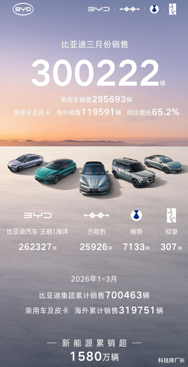 比亚迪3月销量出来了,超过30万辆,平均每天卖近1万辆,每8秒就有一辆新车找到主人。这已经是它连续58个月当中国新能源销冠了,整整五年没让过位。最惊喜的是海外市场,三月份卖了近12万辆,这回没人说比亚迪只会在国内卷了吧。