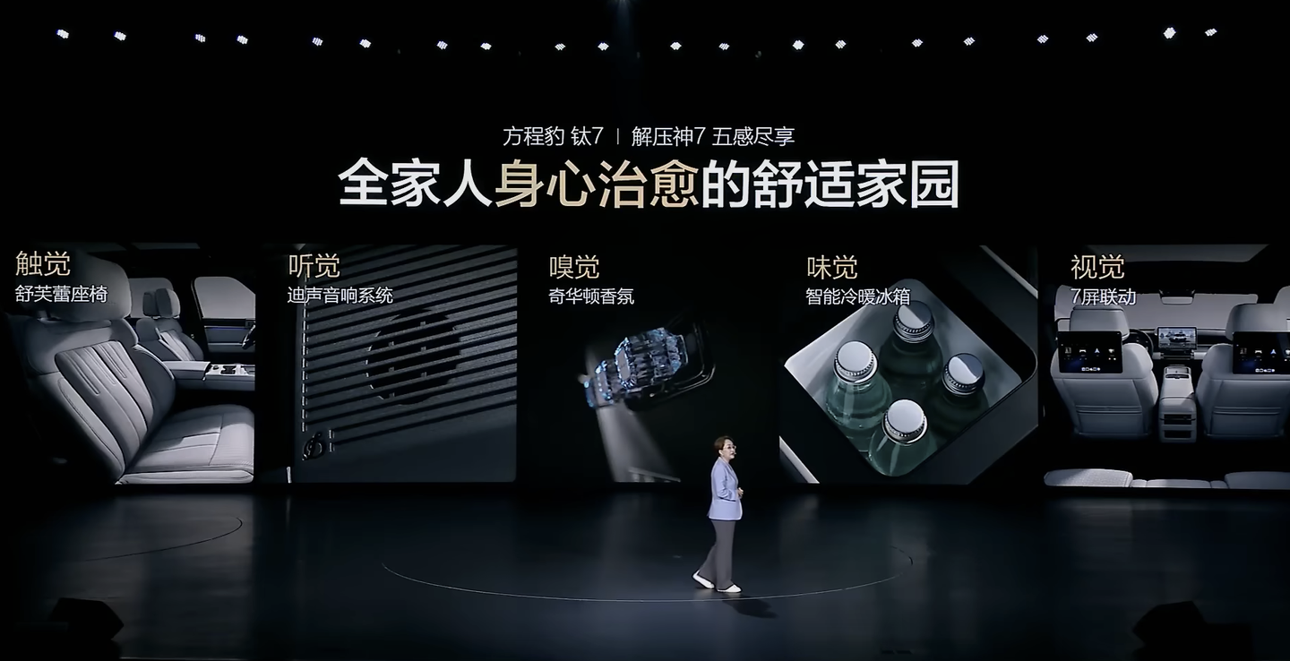 以往比亚迪的发布会,通常是从技术讲起。钛7这次一反常态,先把灯光、内饰、配色讲完了,然后腾出时间来,围绕空间、舒适、香氛、音响、多屏联动、冰箱、露营、智慧生态等事关家人体验的功能,讲了接近40分钟。