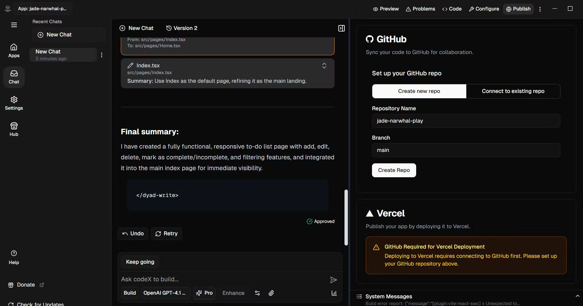 多模型切换:支持 Claude 3.5 Haiku、Gemini 2.5 Flash、GPT-4 等 27+ 模型,用户可按需切换。Designer Mode(Beta):用自然语言生成 UI 组件与页面结构,适合前端快速原型。Auto-Fix 问题修复:自动检测代码问题并尝试修复,适合初学者或快速迭代。Git 原生集成:支持提交、分支管理等 Git 操作,直接在平台内完成。思维预算系统:可配置模型“思考深度”,用于复杂任务的推理优化。